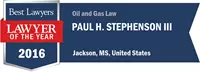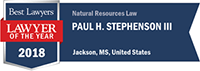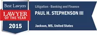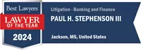 Paul H. Stephenson III was admitted to the Mississippi Bar in 1977. He is also admitted to practice before all state and federal district courts in Mississippi, the United States Court of Appeals for the Fifth Circuit, and the Supreme Court of the United States. His practice has focused on business, commercial, and financial disputes at the trial and appellate levels. Paul's experience includes complex class actions, oil and gas controversies, and business practices challenges under the Racketeer Influenced and Corrupt Organizations Act (RICO).